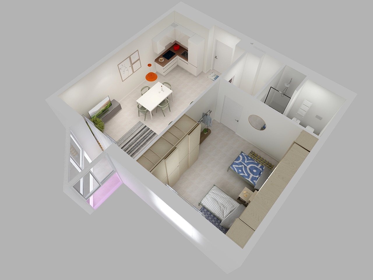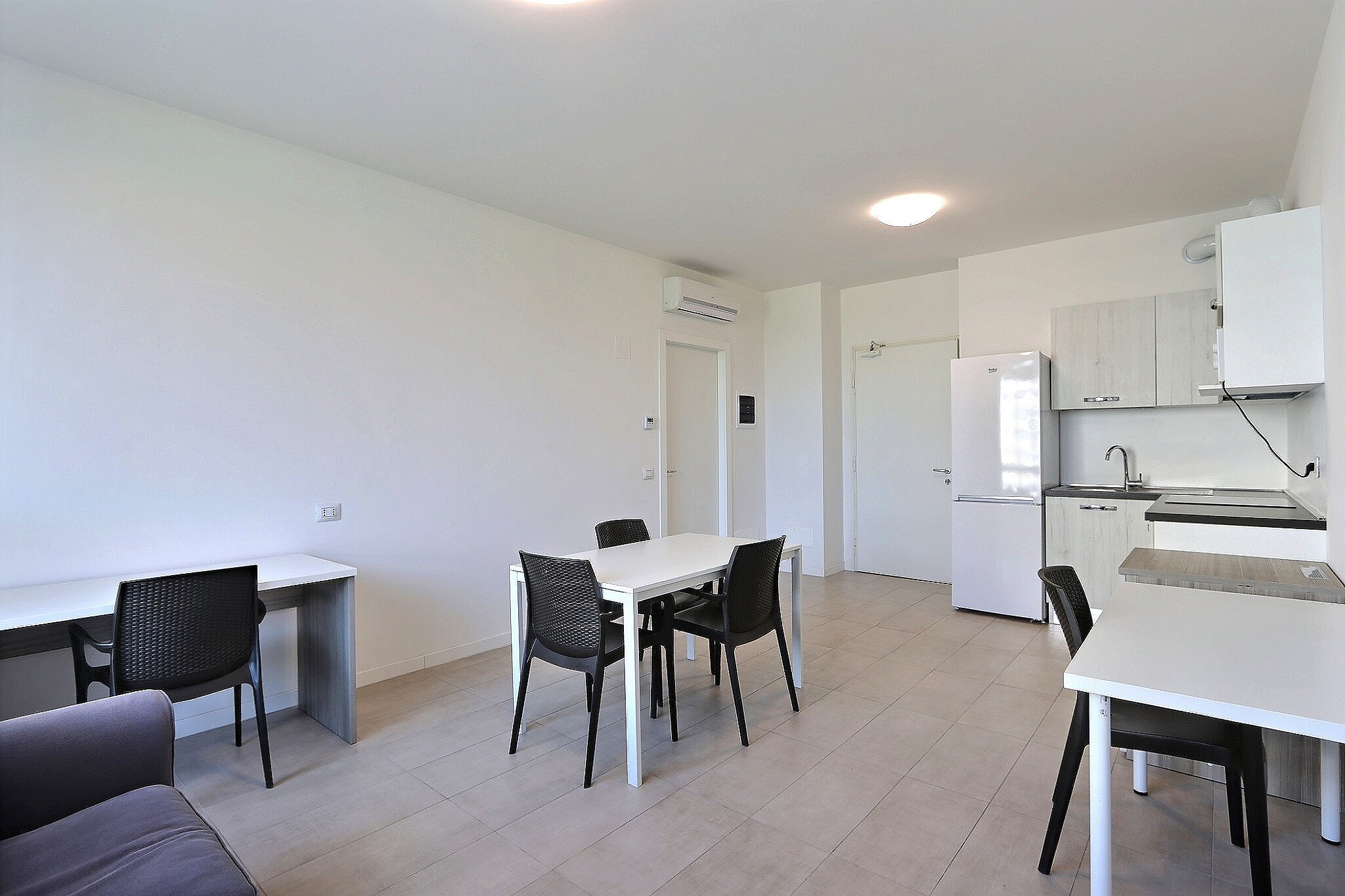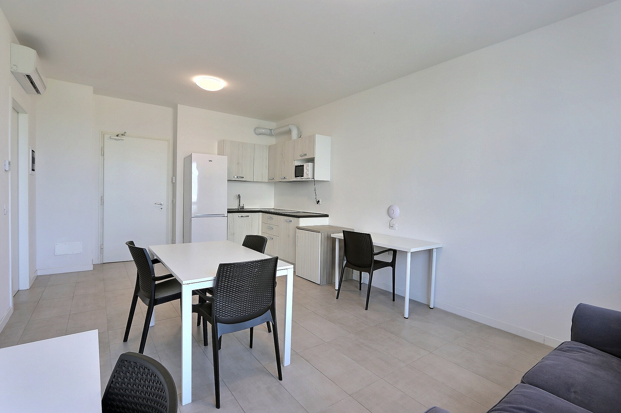 L’appartamento è composto da angolo cottura attrezzato e sala con tavolo, sedie, mobile tv, divano due posti, due scrivanie e sedie, una camera doppia (arredata con due letti, due comodini, due armadi a due ante) e un bagno con doccia. E’ possibile richiedere la camera doppia a uso singola.