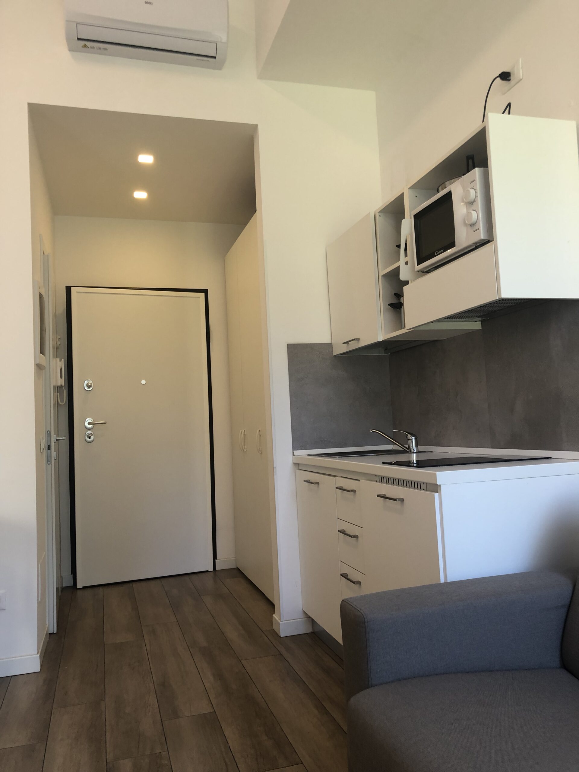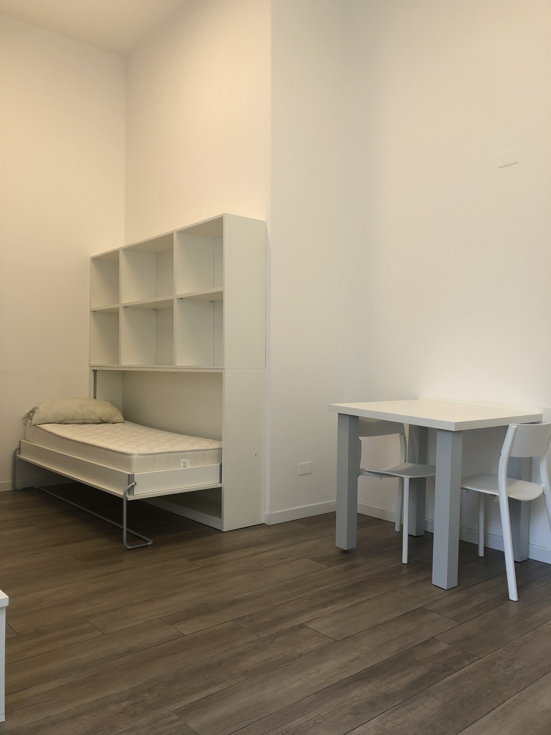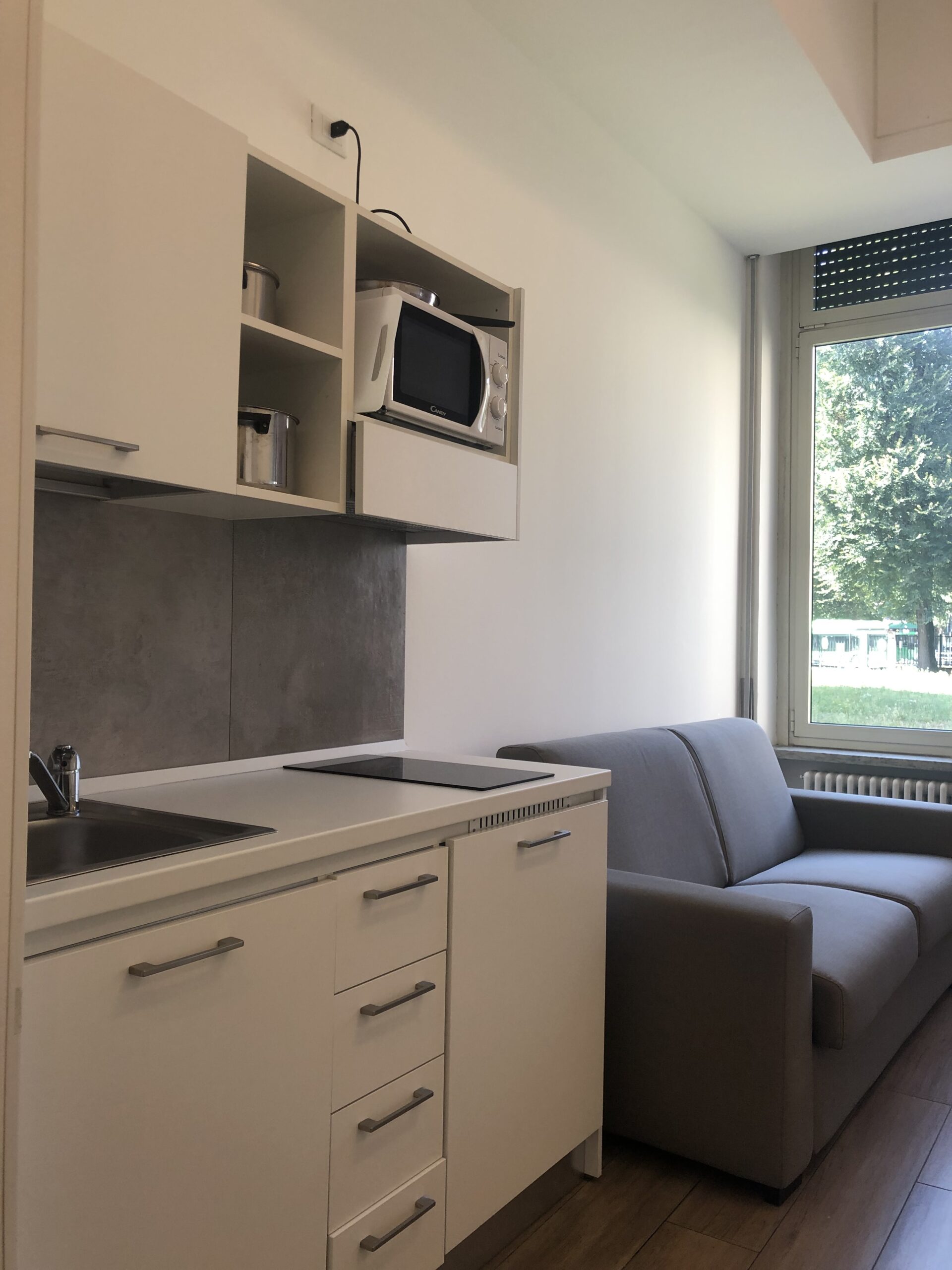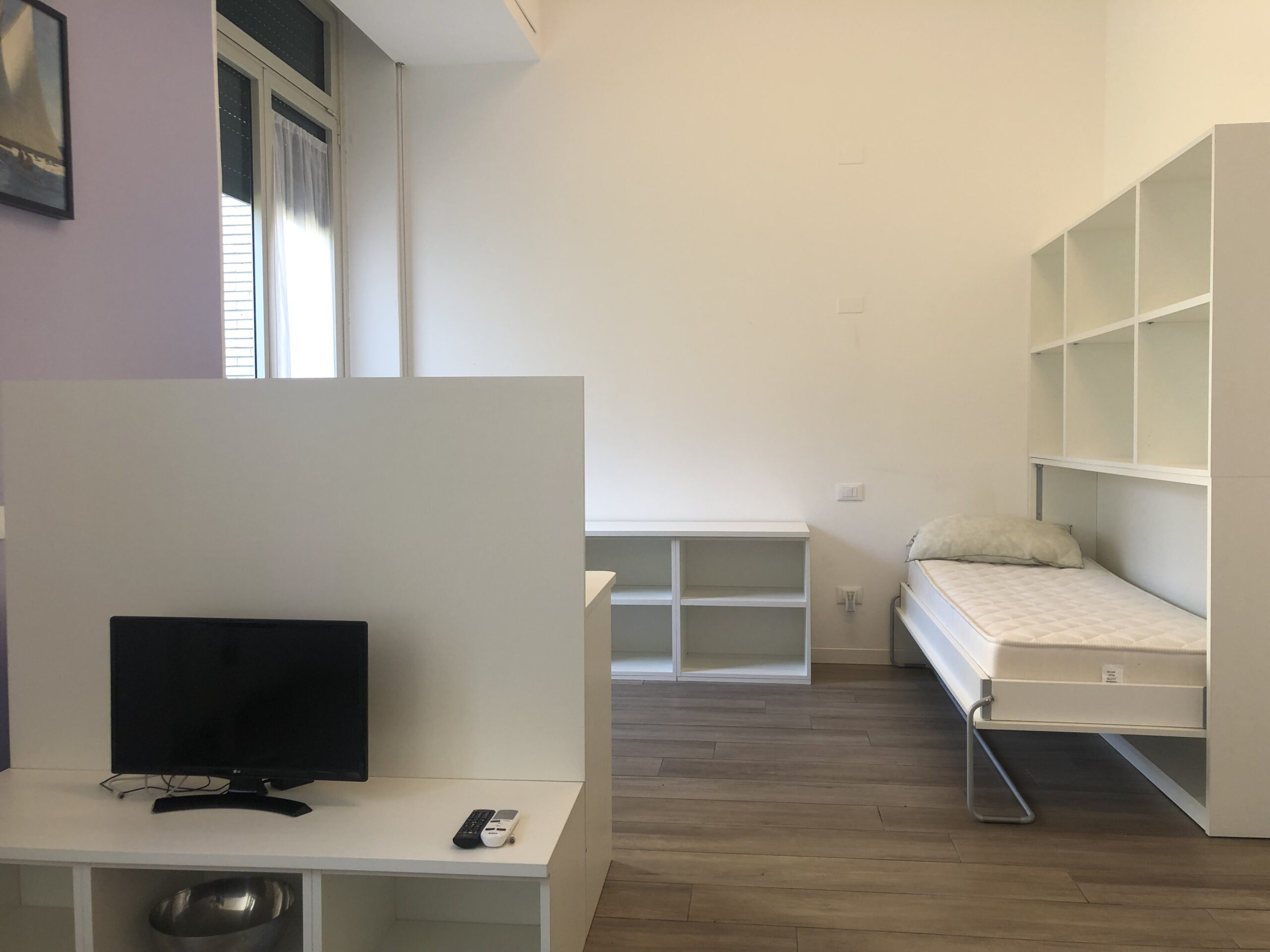 Il monolocale è completo di angolo cottura con piano induzione, piccolo frigorifero e forno microonde, angolo salotto con tavolo, sedie e TV, armadio,  libreria, letto singolo  e bagno ad uso esclusivo.