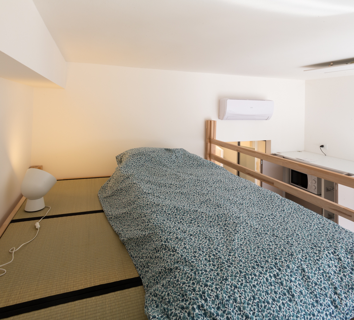 La camera è così composta da: mobile dispensa con frigorifero e forno microonde, angolo salotto con tavolo, sedie e TV, armadio, libreria, letto singolo sul soppalco e bagno ad uso esclusivo.