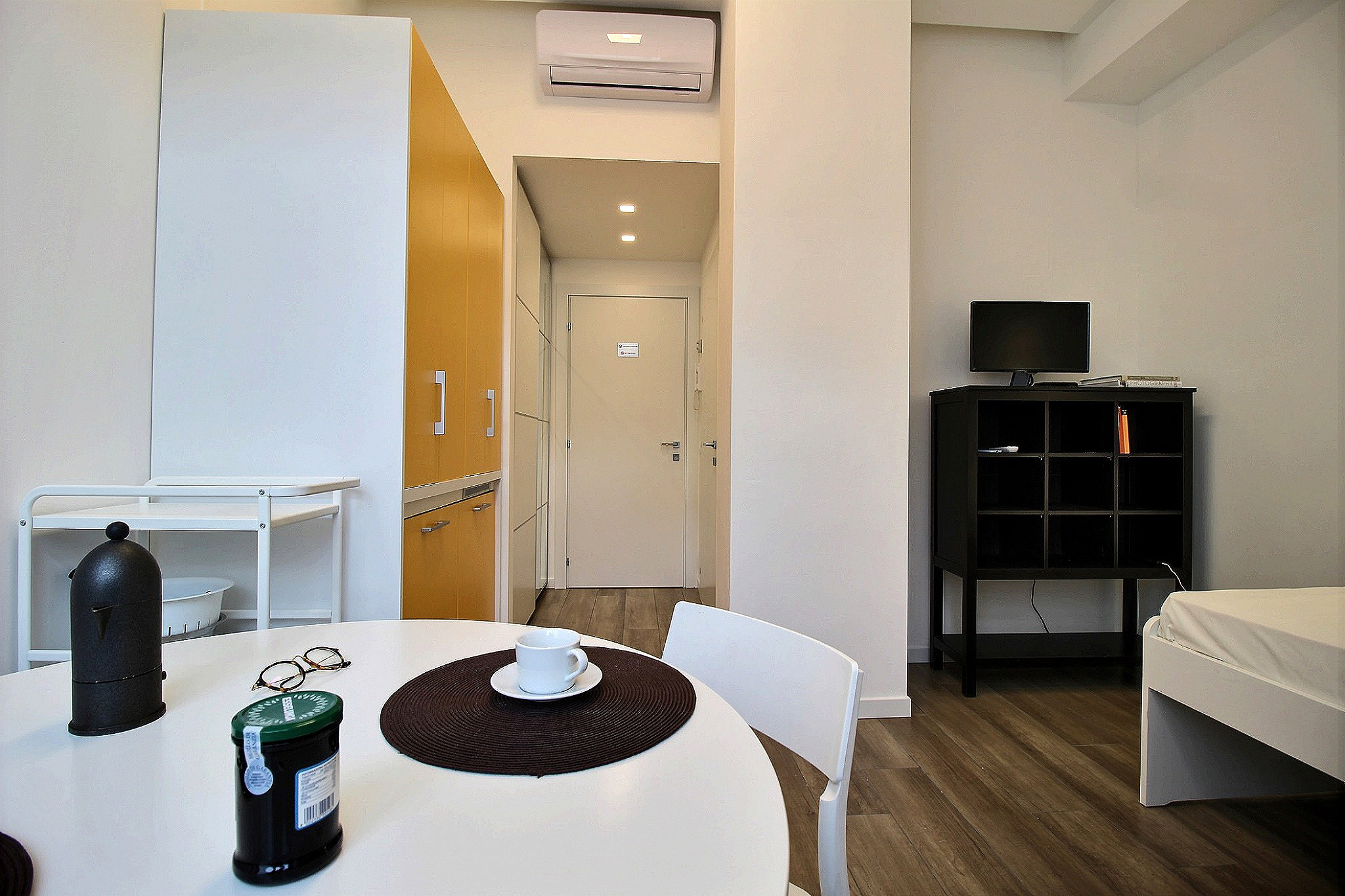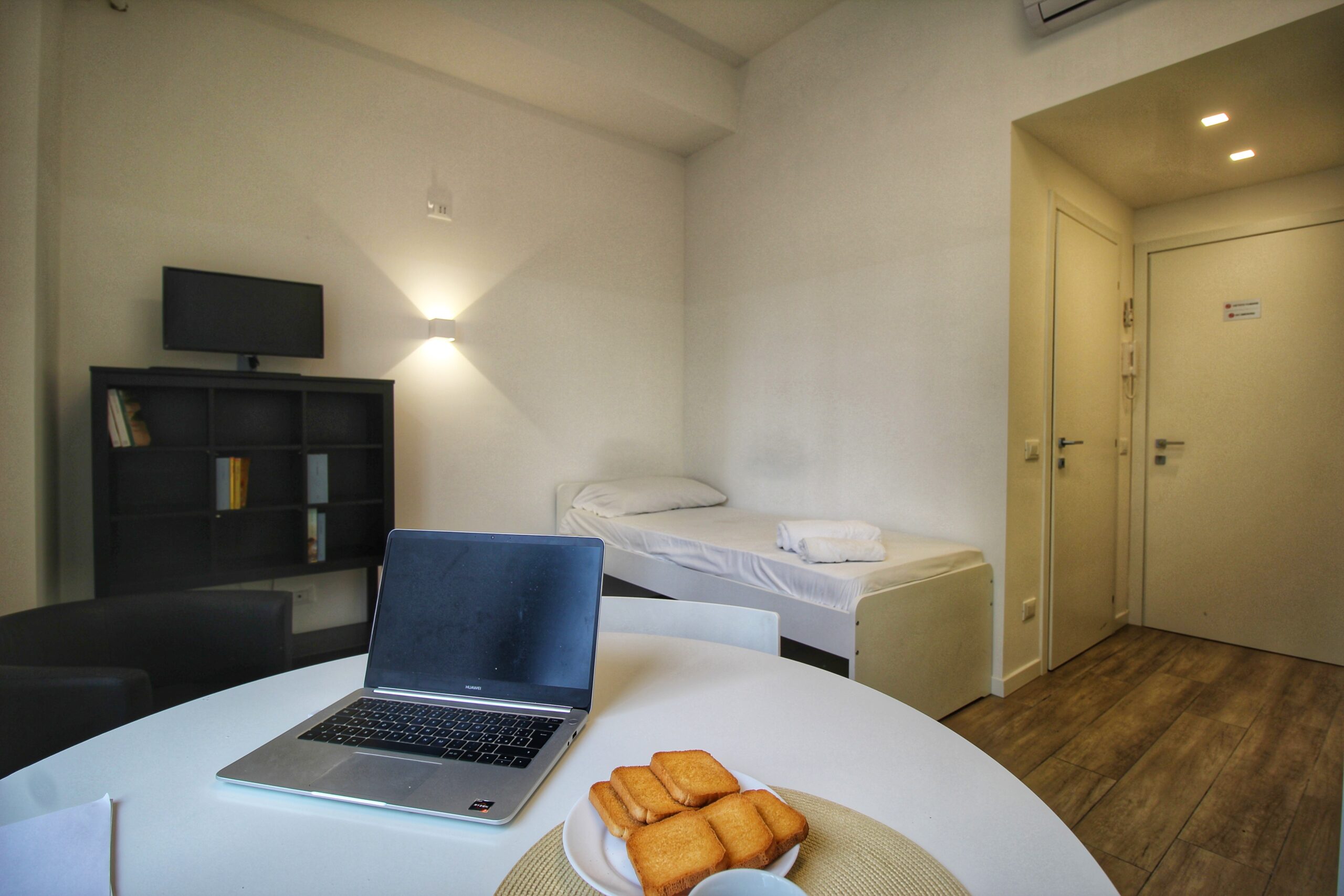 La camera è così composta da:  mobile dispensa con frigorifero e forno microonde, angolo salotto con tavolo, sedie e TV, armadio,  libreria, letto singolo  e bagno ad uso esclusivo.